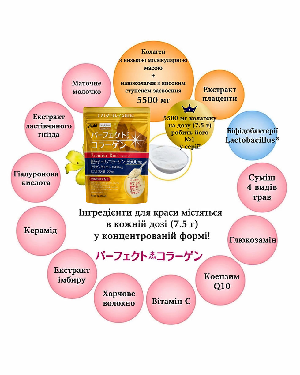 Asahi Колаген з Плацентою, Гіалур. кисл., Q10 Premier Rich 30 дн